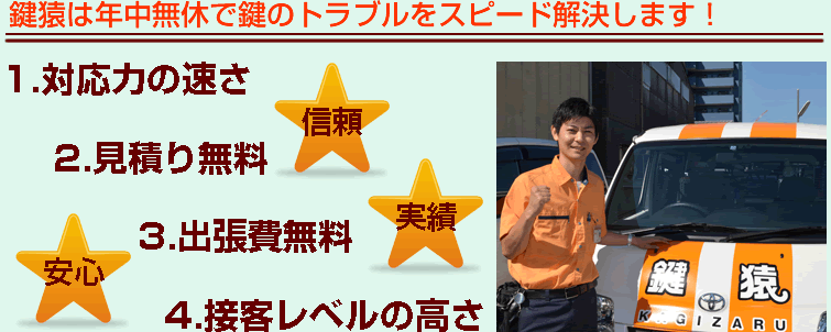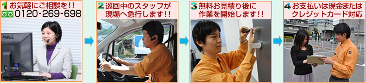 カギが開かないや鍵の紛失はいつどこで遭遇するか分かりませんので年中無休で出張しております。兵庫県を巡回しているカギの作業員がお電話を受けてから鍵の現場へ向かいます。 自社運営のコールセンターがお客様のカギのトラブル状況をお聞きし、鍵の専門スタッフを手配します。お客様の鍵のお困りごとを解消できる最善策を提案し、お見積り致します。 西宮市や宝塚市、尼崎市や伊丹市ほか住宅街や神戸市の繁華街など兵庫県の市街地から郊外まで鍵の部材を積んで、出張致します。出張費や見積りには料金は発生致しません。
