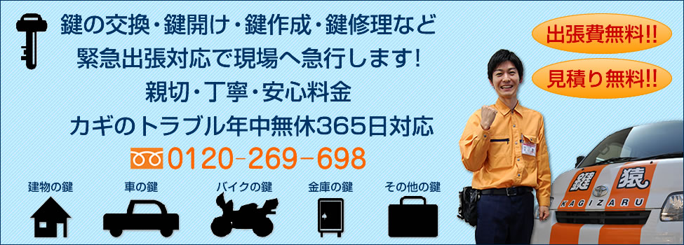 兵庫県の阪神地区である芦屋市や尼崎市、伊丹市や宝塚市、西宮市や三田市、川西市をはじめ、神戸市ほか兵庫県内に出張する鍵屋は年中無休でスピード対応! 玄関の鍵開けや交換、トイレの解錠や車の鍵作成、金庫解錠やバイクのキー紛失、スーツケースのTSAロック解除、ロッカーやキャビネットのカギ開錠などを解決します。 倉庫や引き戸錠、開き戸錠や補助錠の取付け、室内ドアにカギ追加、電子キーやデジタルロックへカギ変更ほか、カギのことは専門店であるカギ屋にご依頼下さい!